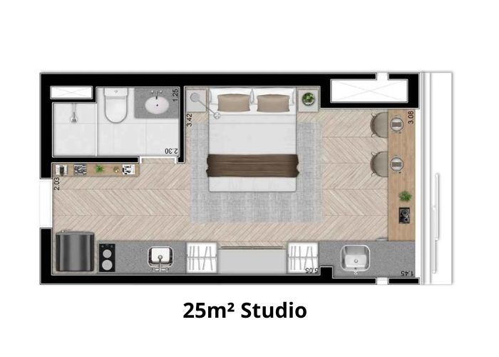 Os studios possuem uma planta funcional com 25m² e banheiro.