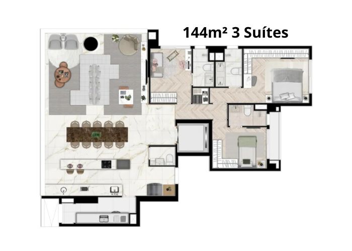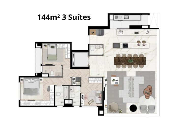 O empreendimento possui apartamentos amplos de 144m² com 3 suítes e duas ou três vagas em torre única.