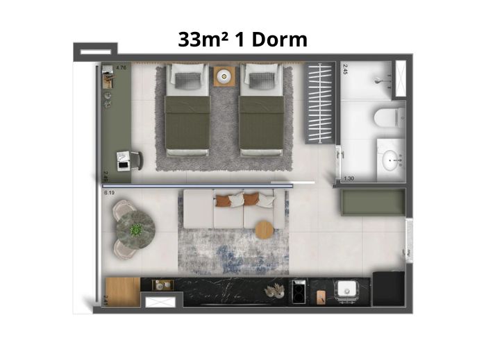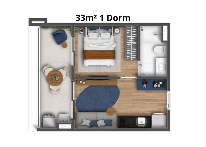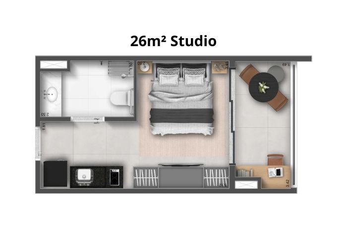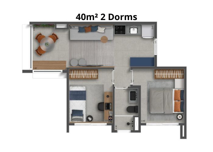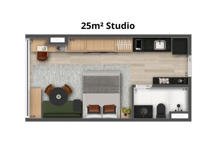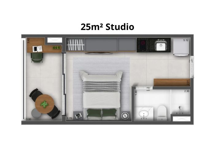 Suas plantas variam de 25m² a 40m² e 1 a 2 dorms/studios, com ambientes pensados para proporcionar máxima funcionalidade, se adaptando ao estilo de vida do morador.